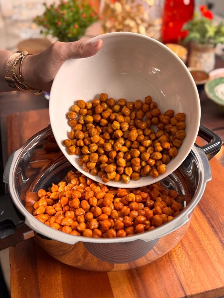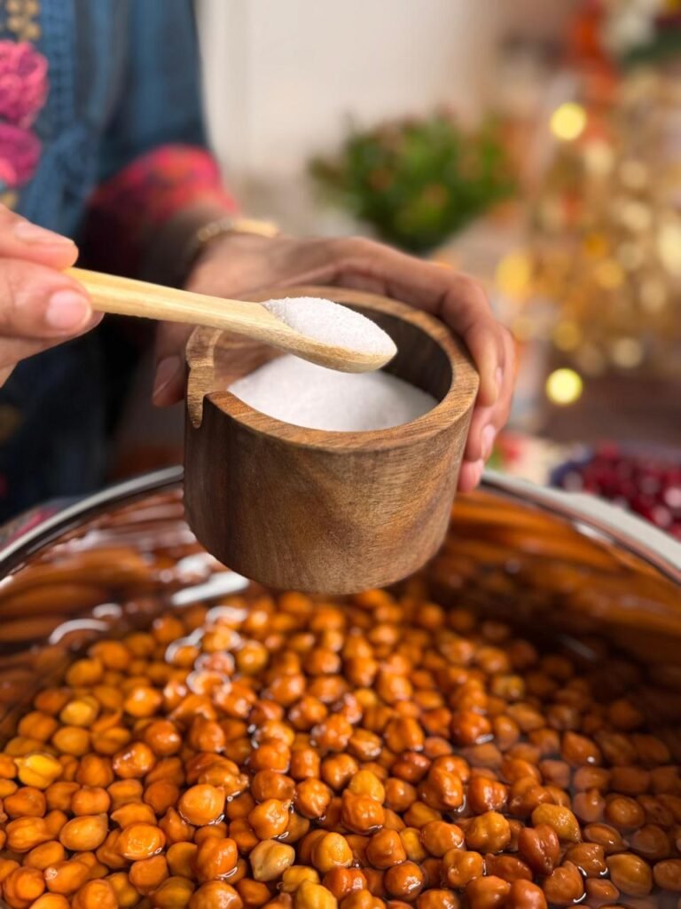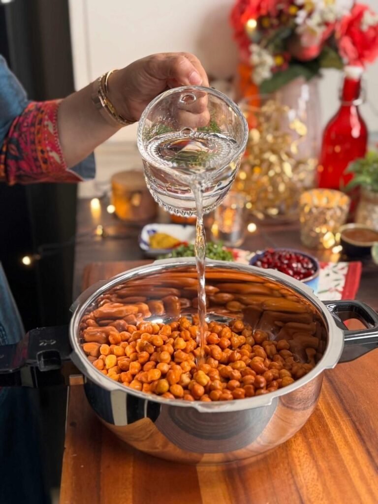 - Add some salt and enough water, then pressure cook until they are tender but still have a bit of a bite. Overcook mat karna, we don’t want mushy chana!