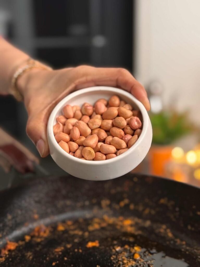 - In the same pan, heat another 2 tsp oil and add 1/2 cup peanuts.
