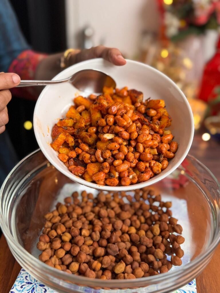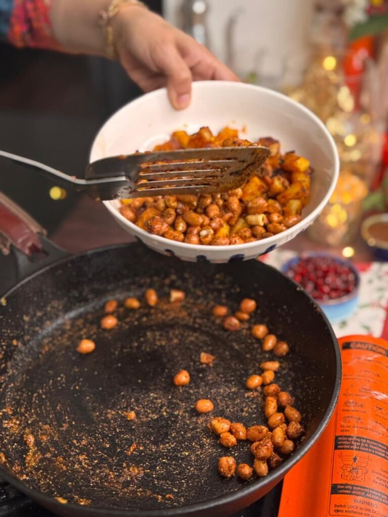 - In a large mixing bowl, bring together the boiled chana, the crispy sweet potatoes, and the masala peanuts.